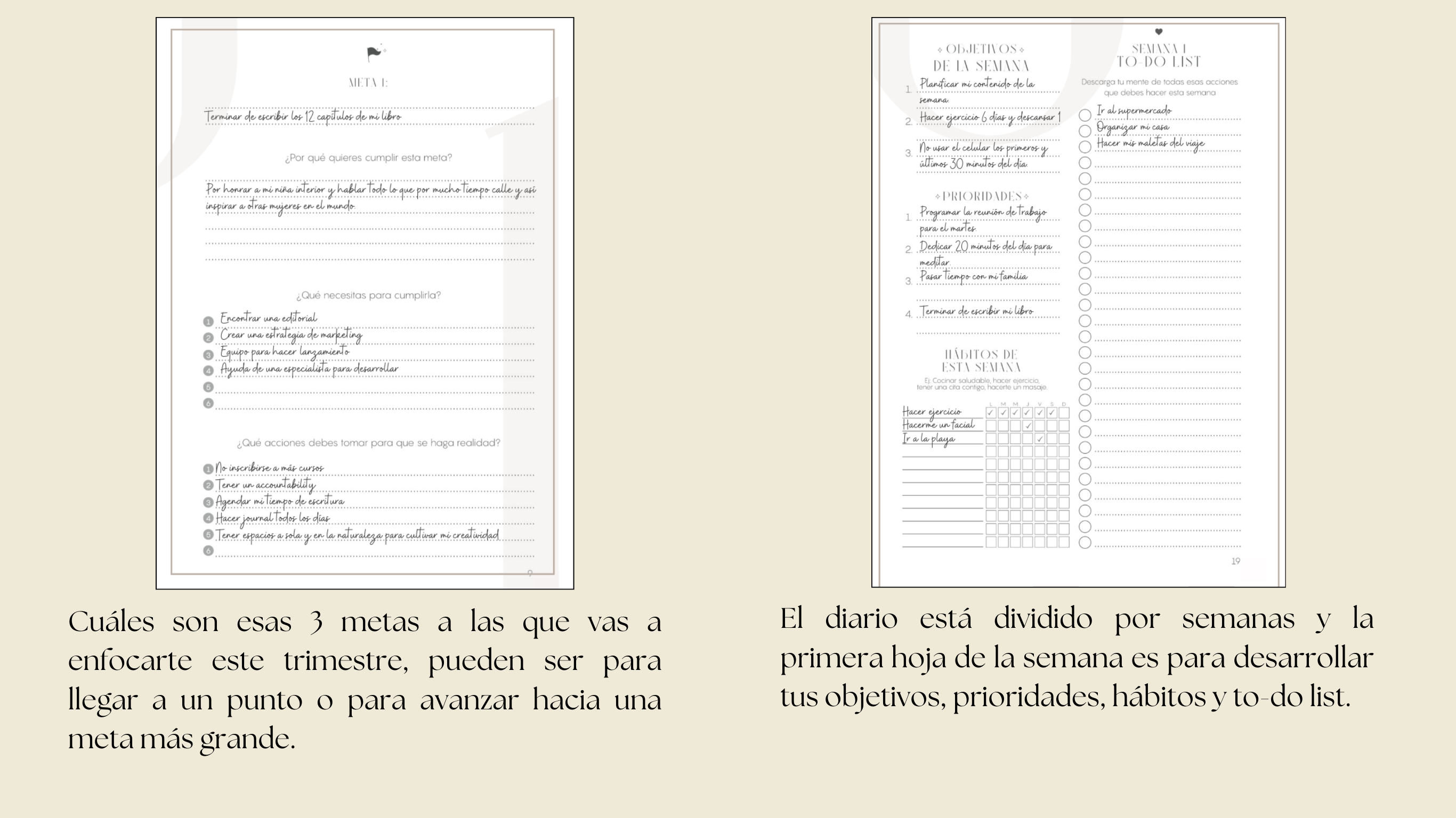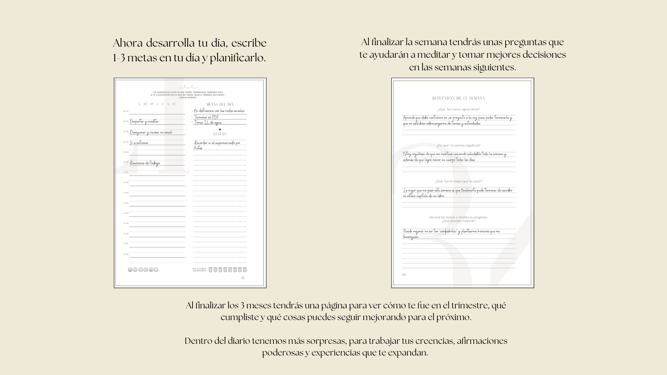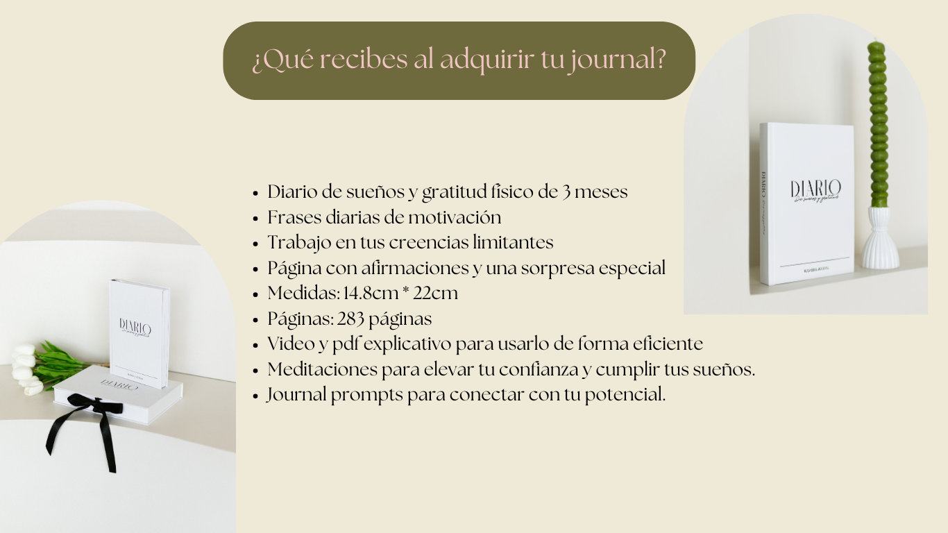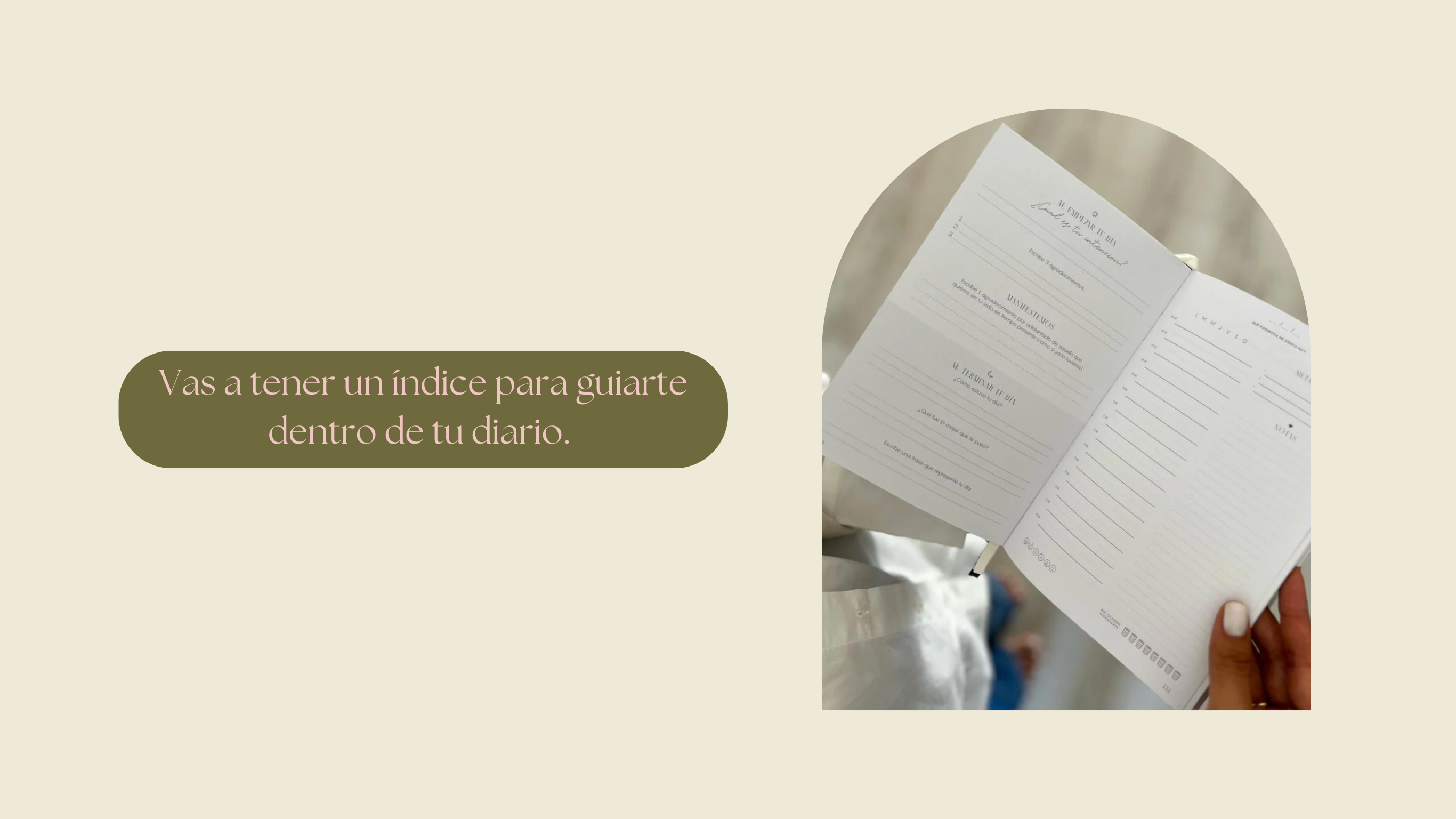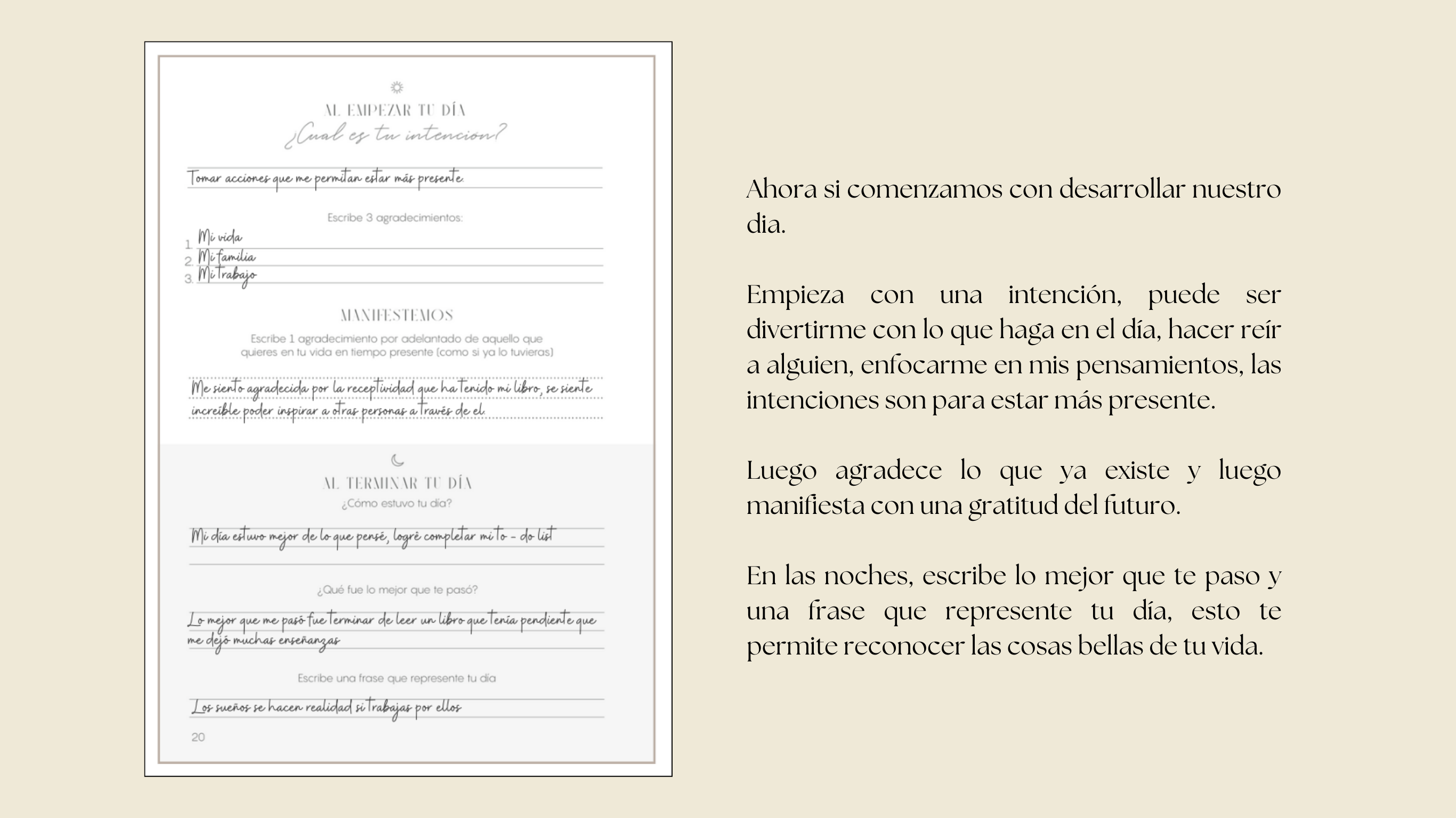 Al recibir el diario tendrás una tarjeta con dos códigos QR uno es un video explicativo de cómo se usa el diario y el otro es un PDF que explica más a profundidad y también tienes meditaciones y journaling prompts incluidos.
